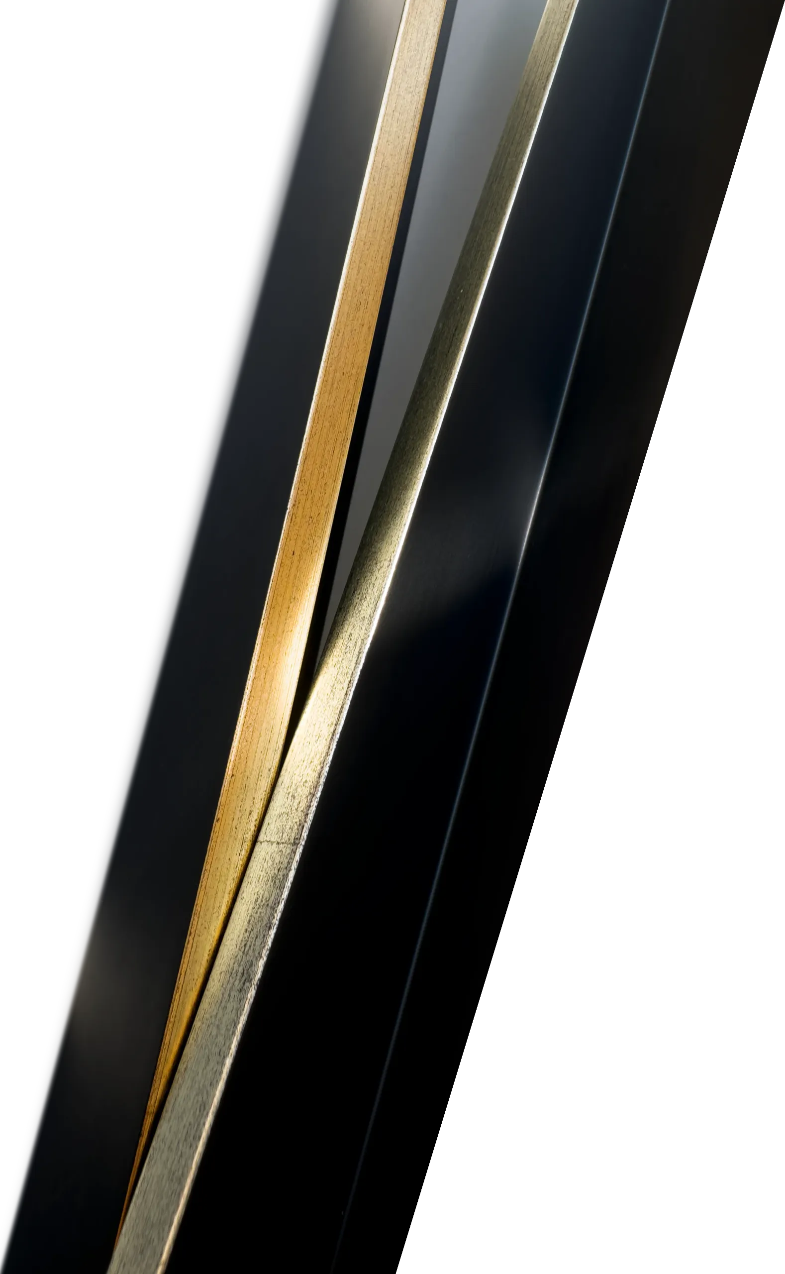 Massivholz. Mehrfach seidenmatt, tiefschwarz lackiert. Anschließend veredelt mit einer leicht antiken Silber – oder Goldkante, das Licht sanft reflektierend.